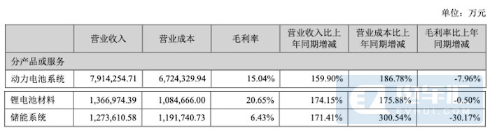 從業(yè)務(wù)產(chǎn)品看,上半年動(dòng)力電池板塊營收791.43億元,同比+159.9%,毛利率為15.04%,同比-7.96%。