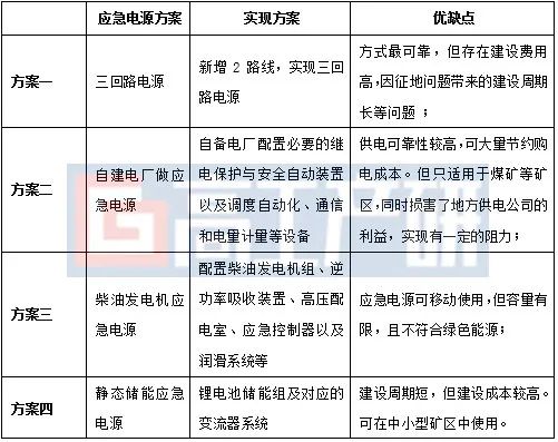 礦區(qū)應(yīng)急電源的選型要依據(jù)礦區(qū)的實際情況,從安全性、經(jīng)濟性、實用性、可靠性等多各方面考慮,確保備用電源真正起到作用。目前國內(nèi)礦區(qū)使用的備用電源類型主要包括引入第三電源、自備電廠、靜態(tài)儲能、車載柴油發(fā)電機四種形式。