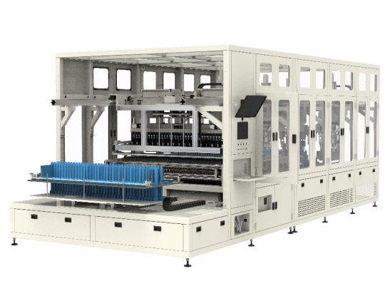拘束托盤通過物流進入LPM設(shè)備內(nèi)→設(shè)備定位機構(gòu)動作定位拘束托盤→解拘束→均勻打開拘束隔板→電池上料→電池上料整定→天車機械手抓取36塊電池→36塊電池放入加壓測試治具→刺針接觸測試→IRM測試→LPM測試→天車機械手取出36塊電池→電池下料整定→電池下料